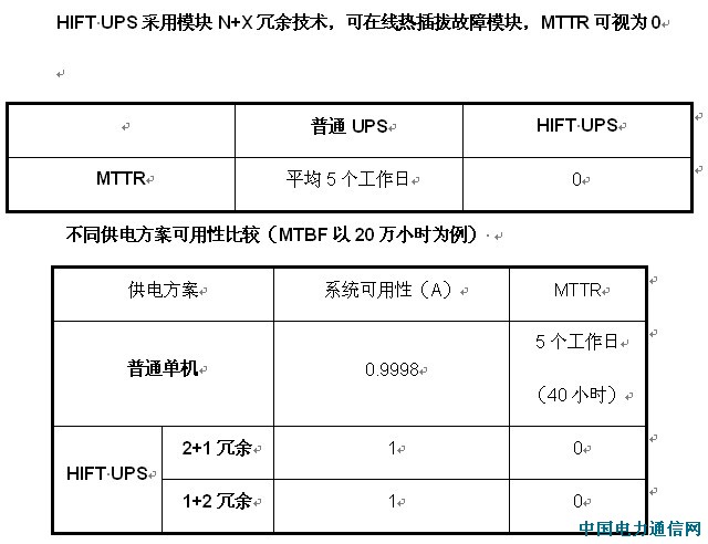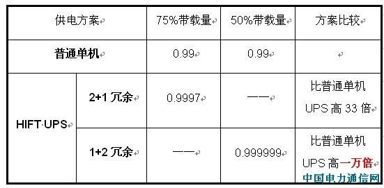 HIFT UPS组成的N+X冗余供电系统,系统的实际负载量占设备容量的大小与系统的可靠度息息相关,实际负载量越低,系统冗余度越高,系统可靠度也就越高。这恰恰是普通UPS所无法比拟的。