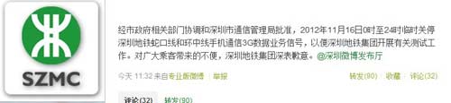 11月16日下午消息,三大电信运营商短信通知关闭深圳地铁Wi-Fi有进展,今天上午11时,深圳地铁才在官方微博回应,称关闭1天3G数据业务信号开展相关测试。