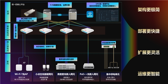 极简以太彩光4.0方案通过1:16高密彩光技术、单端口160G带宽能力,将网络性能提升至业界2倍以上,支持单框1536个终端接入,入室独享万兆,为用户带来优质用网体验。同时,通过大二层无源组网设计,实现弱电间“零运维”,有效降低能耗与故障风险,为超大园区部署提供架构保障。