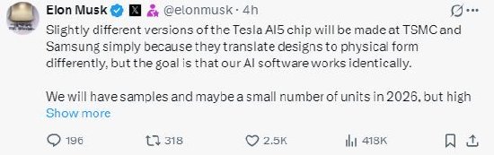 马斯克写道:“台积电(294.05, -10.81, -3.55%)和三星将生产略有不同的特斯拉AI5芯片版本,因为它们将设计转化为物理形式的方式不同,但目标是我们的AI软件同样有效。