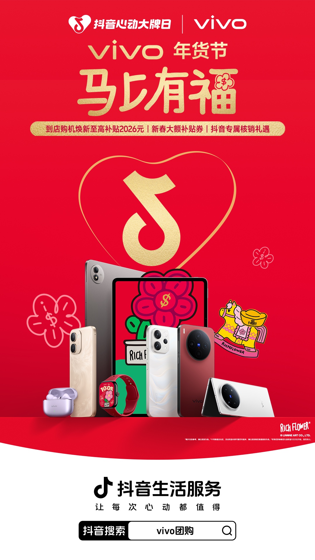本次年货节,vivo带来了诚意十足的“年货全家桶”,vivo X300新春配色焕新登场。活动设置了「抖音心动大牌日」专属优惠,平台限量至高补贴2026元,精准卡位“新年换新机”心理预期;联合“有钱花”IP打造限定核销礼与周边,将“马上有钱”的好彩头握在手里;组合购立减覆盖平板、手表、手机,一站式满足全家桶焕新需求;马上拍福照互动赢取“马上有福”金饰盲盒、有钱花定制周边;同步推出学生专属优惠,让年轻一代的第一部旗舰机亦从vivo开始。从价格优惠到情绪价值,从硬件参数到新年彩头——vivo把“年货”真正做成了“年礼”。