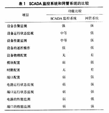 网管系统对通信设备和通信网络进行全面的管理,包括实时数据采集及其处理;物理设备和逻辑电路资源的管理;提供告警、性能、配置等方面的管理功能。网管系统基本操作对象为网元和网络(物理设备、逻辑电路),通过对网元的实时数据收集,实现网元运行状态的管理。这些年,SCADA监控系统和网管系统在电力通信网络的运行管理方面都发挥了积极的作用,表1对两种系统的实际应用和功能特点作了比较。