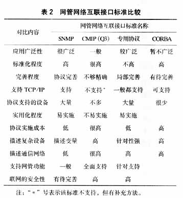 建议网管网络互联的基础平台采用TCP/IP协议平台。TCP/IP是当前广泛流行的互联网的基础平台,也是目前软、硬件技术发展最完善的网络平台。采用这样的网络平台在硬件设备和网络软件应用方面会得到强大的技术支持。网络互联的高层标准接口,目前有多种可选择的国际标准,例如:Q3接口的公共管理信息协议标准(common man-agementinformation protocol,CMIP)、开放式的移动互联网平台(open mobile internet platform,OMIP)、互联网中流行的简单网络管理协议标准(simple network management protocol,SNMP)、近年来发展迅速的公共对象请求代理体系标准(co mmon object request broker architecture,CORBA)以及大量实际应用的专用协议标准等。这些标准都有其特点,它们之间的比较见表2。