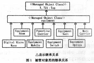 信息模型是用面向对象的方法为与管理相关的资源建立的模型,由此产生了一套构造管理信息库的方法。信息模型在网络管理中处于核心位置。根据XML可以描述大量的现有管理标准和部署方案中所表示的信息模型,还可以使用其它普通的工具来浏览、编辑和处理这些模型。根据电力通信网管理功能的要求,需要对设备的工作状态进行监视,对设备的状态告警和相关资料进行管理。由此,要对电力通信网中的所有设备进行类划分。针对不同的要求确定不同的监测信息,并用不同的状态量表示,通过监测状态信息来判断设备的运行情况。当对设备的状态告警进行管理,要把设备的告警级别分为不同的等级。要确保设备的告警信息能及时准确地上报给管理者,管理者收到告警信息后做进一步处理。同时还有提供告警数据的统计功能。设备的相关资料包括设备的生产厂家、使用情况、配置方式、规格型号等。根据电力通信网的组成情况,可以将设备分为数字微波、电力线载波、卫星通信、光纤通信、数字程控交换机、移动通信、多路模拟载波和通信机房等8种类型。作为电力通信网的被管物理资源,按照功能和特性,可分别定义这些设备的管理信息模型。根据ITUT建议书M.3100的建议,用UML图建立被管对象类之间的继承关系,如图1所示。