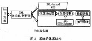 XML分析器和解析器的目的是在系统的设计过程中保持传统的HTML的优势,把它们结合起来。XML分析器/解析器的主要任务是把浏览器端提交的HTML格式的表单内容转换成XML文档,将服务器端的XML文档以HTML格式在WEB浏览器上显示。系统会根据鼠标选中的设备在索引目录中的ID号,利用XPath匹配MIB中设备序号,以统一的形式来显示相应设备的所有参数。应用程序还可以利用XML DOM提供的API来和任何编程语言一起使用,完成动态的访问、添加、删除和修改MIB的内容以及显示结构和样式等。