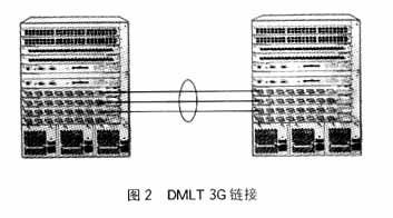 distributed multilink trunk(DMLT)是在multilink trunk的基础上,在配置互连的链路时,多条链路端口可分布于交换机不同的I/O模板(图2)。这样,交换设备中某个I/O模板出现故障时,不会影响链路连接。