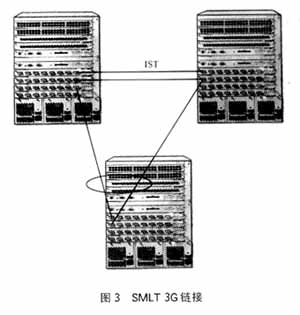 split multilink trunk(SMLT)是在DMLT的基础上将两台交换机在逻辑上作为一台交换机,实现在不同交换机上的MLT,从而在节点级保障了链路的安全冗余(图3)。