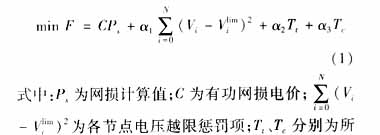 电力系统无功电压综合控制是指满足系统各种运行约束的条件下,通过优化计算确定发电机的机端电压、有载调压变压器的分接头挡位和无功补偿设备投入等,以达到系统有功网损最小和各节点电压约束。其数学模型如下: