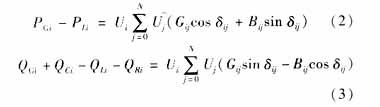 式中:N为 电网节点总数;PGi,PLi为分别为节点i发电机有功出力和有功负荷;QGi,QCi,QLi,QRi分别为节点i发电机无功出力、容性无功补偿容量、无功负荷和感性无功补偿容量;Gij,Bij,δij分别为电网中节点i和j之间的电导、电纳和节点电压相角差。
