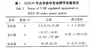 基于改进SA算法的无功优化程序在IEEE30节点的系统中进行了计算,IEEE30节点网络包含6个发电机节点、22个负荷节点和41条支路。各无功调节设备的调节范围如表1所示。改进SA算法与简单遗传算法(SGA)及其它文献中的方法进行了比较,结果如下表2所示: