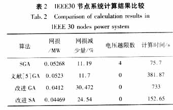 由计算结果可见,较之SGA算法,及改进GA算法,改进SA算法在较短的时间内更有效地降低了网损,减少了电压越界节点数,优化了整个系统的电压水平和电压分布,同时也较好的控制了计算时间。