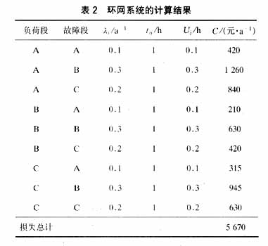3.2.2有备用连接(环网) 计算结果如表2所示。在这种情况下,负荷段A,B和C的可靠性指标被改善。与没有备用连接时的损失差为17 010元/a。 3.2.3有备用连接(环网)加电流故障指示器 计算结果如表3所示。在这种情况下,负荷段A,B和C的可靠性指标被改善。与没有电流故障指示器时的损失差为2 835元/a,但需增加投资3000元。