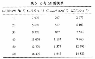 3.2.4有备用连接(环网)加DMS 计算结果如表4所示。在这种情况下,负荷段A,B和C的可靠性指标被改善。与有备用连接(环网)没有电流故障指示器时的损失差为5 103元/a,但需增加投资100 000元。 3.3综合效益分析 少供电量单位费用系数b与环网系统年损失费用Cr,带DMS系统年损失费用Cr,DMS以及这两种系统年损失费用之差ΔC的关系如表5所示。