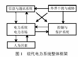 随着现代通讯技术和信息技术的发展,为了保障大电网的安全和经济运行,各种信息系统, 如调度自动化(SCADA/EMS)、配电网自动化系统(DA)和变电站综合自动化系统(SA),电力市场技术支持系统等在电力系统领域里得到了广泛应用。图1给出了现代电力系统的整体构架,电力系统与信息系统、通信系统已经融合成为高度集成的混杂系统,电力系统的监测和控制越来越依赖于信息系统和通信系统的可靠运行。信息系统中的计算机系统是核心,计算机系统的维护不当是8.14美加大停电的基本原因之一。一个关键通信系统发生故障会使整个系统陷于瘫痪,进而失去可控性和可观测性。因此,必须把电力系统安全性的概念加以拓展。