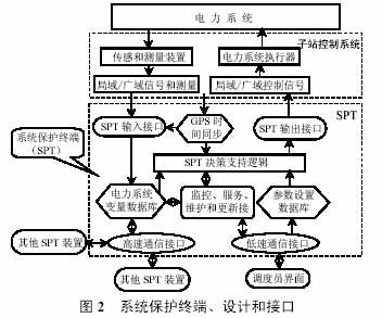 最近研究人员提出了系统保护终端(System Protection Terminal,SPT)的思想[6],如图2所示,终端接于变电所的控制系统。为了应用时标,需要有GPS功能。SPT具有高速通信界面,在终端数据库间进行电力系统数据交换,数据库中有该变电所所有实时刷新的量测值和信号,以及为该变电所控制所需的其它SPT数据。