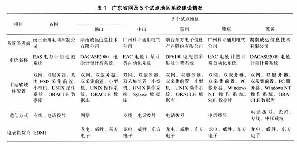 广东省网(以下简称省网)关口电能量计量遥测系统于1999年开始筹建,到2001年底系统建设完成。地区关口电能量计量遥测系统于2000年8月开始筹建,首批选取佛山、中山、惠州、茂名和肇庆5个地区作为试点,到2001年底5个系统建设全部完成。5个试点地区外的其余16个地区电能量计量遥测系统的推广建设工作也已经全面展开。省网及五个试点地区系统建设情况如表1所示。