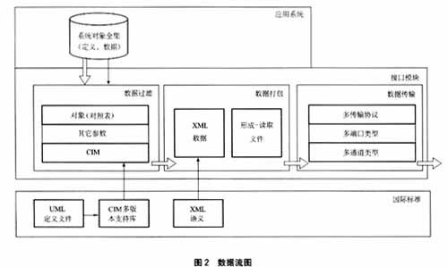 本设计方案使用COSEM接口程序作为系统间的适配器,将数据交换通道上的XML格式的COSEM对象数据解读并载入应用系统,并将系统内的数据转换为XML格式的COSEM对象数据在数据交换通道上传送。图2描述了其实现机制,其中接口模块包括数据过滤、数据打包以及数据传输3个子模块。
