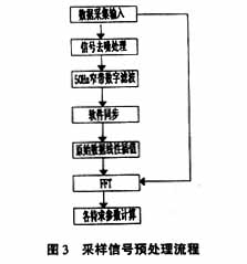 由于在现场实测信号中,不仅包含由基波及各次谐波叠加而成的合成信号,而且还包含噪声信号,噪声信号的存在会大大影响电能质量的测量精度,这样在谐波分析、信号频率的确定等方面会有很大的误差。考虑到下位机硬件DSP在FFT(FFT是一种基于对非周期信号的周期延拓后进行的变换)的方便性,采用FFT原理进行数据的实时处理。在实际应用中要得到准确的FFT运算结果,必须满足Nyquist采样定理的要求,防止频谱混叠的发生,而且根据FFT算法的要求,采样点应均匀分布在一个信号周期内,即应当实现严格的同步采样,否则就会引起信号的频谱泄漏,带来很大的测量误差,特别是对高频分量,计算出来的值就没有可信性。因此,需要对采样值进行数字信号预处理,以减少误差。图3给出了整个数据预处理流程。