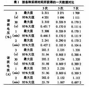 根据一天的实测数据(取自100 MVA直流电弧炉用户的母线150 kV),在表1中对比了几种时 间间隔所得到的3次、5次和7次谐波电压和谐波电流的最大值和95%概率大值。从表1中可以明显地看见3 s、30 s以及1 min这三种时间间隔所获得的谐波电压和谐波电流的各项数据仅有微小差别,而2 min时间间隔则与3 s时间间隔所得的各项数据相差较大。