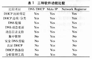 我们对市面上的若干个主流厂家相关软件进行了调研和测试,最后选定了三种软件NS/DHCP、Meta IP和Network Registrar进行了深入详细的分析和比较,结果如表1所示。