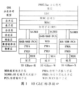 (1) 10 GbE物理媒体层:包括如图1所示的10 GBase-R、10 GBase-RW等.光纤媒体的 型号具体表示方法为:10 GBase-[媒体类型][编码方案][波长数],或更加具体些表 示为: 10 GBase-[E/L/S][R/W/X][/4].