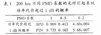 (1) 抑制PMD的最直观的方法是选用低PMD系数的光纤.相同长度、不同PMD系数的光纤,其PMD均值相差很大,因而对系统的影响也大不相同.采用APD接收时,通常认为0.3 bit的瞬时差分群时延(DGD)对应的功率代价为1 dB;采用PIN接收时,通常认为0.4 bit的瞬时DGD对应于1 dB功率代价[1].对于40 Gbit/s系统而言,经过200 km不同PMD系数的光纤传输后,利用PMD的概率密度函数[1],通过数值积分可计算出功率代价超过1 dB的概率如表1所示.由表1可见,PMD系数越小,概率越低.采用低PMD系数的光纤能够显著降低功率代价超过1 dB的概率.但除光纤之外,组成光纤通信系统的光放大器、耦合器、隔离器及光开关等元件也会产生PMD,从而影响系统性能.