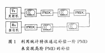 (1) 通过分布式补偿一阶PMD来抑制高阶PMD.该技术由朗讯公司在ECOC2002上提出[3].由于各阶PMD的统计特性有着内在的联系,利用这种内在的联系,通过分布式补偿一阶PMD,就可以抑制高阶PMD.对于二阶PMD而言,它的DGD的均方值与一阶PMD之间满足