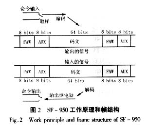 SF-950的帧结构如图2所示。每个帧包括帧定位和一个用于辅助信息的字节,两者的长度均为8 bits。这些8位后接着用以传送保护命令的8位字节分组码(64 bits)称为码文。一个帧中的比特数为80,而帧时间为1.25 ms。