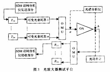 对于光放大器的测试,一般可在专用的测试平台上进行,当不具备专用测试平台时,一般只采取对关键指标的验证测试方案。如图3所示。