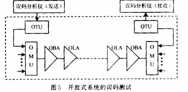 (1)系统误码率性能测试 系统分为开放式和集成式2种。如图4和图5所示。差错性能测试的目的是检验系统的差错性能是否符合设计要求。一般用误块秒比进行衡量。在实际测试中,要根据具体的测试配置和测试要求,选择合适的测试信号结构,当信号输入口为PDH口时,测试信号为伪随机二元序列(PRBS);当信号输入口为SDH时,不管速率是多少,发送的测试信号都一定是具有一定帧结构的测试信号,在ITU-T O.150建议中,规定了8种SDH测试信号结构(TSS1,TSS2,TSS3,TSS4,TSS5,TSS6,TSS7,TSS8)。一般来说,对通道的误码测试,应根据所测通道级别选择测试信号结构[3]。