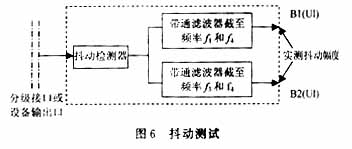 (2)系统的抖动和漂移特性测试 衡量抖动和漂移大小的单位是单位间隔(UI),一个UI是指等步信号2个相邻有效瞬时之间的标称时间。对于比特率为B的信号相对应的单位间隔为1(UI)=1/B(s)。关于系统抖动的测试配置图5大部分相同,只是将发送误码分析仪换成码形发生器,将接收误码分析仪换成抖动测试仪就行了。图6为输出抖动测量装置图。