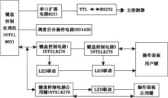 键盘板由键盘控制处理机、键盘控制和LED驱动电路、调度台振铃电路、串口通信电路等部分组成。其中每块INTEL8279控制40个用户,公有部分用一块INTEL8279控制。一块键盘控制板最多可控制200个用户,控制用户超过200个,用2块以上键盘控制板。