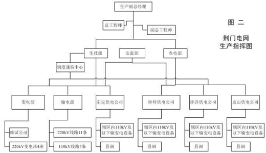 荆门供电公司生产指挥图如图二:4个县级供电公司,主要负责维护110kV及以下输变电设备的运行、维护、检修及35kV及以下输变电设备的调度工作,其中图一中的东宝变、苏台变、兴隆变属东宝公司维护,后港变、沙洋变属沙洋公司维护,钟祥变、郑家湾变属钟祥公司维护;变电部负责4座220KV变电所的运行、维护及检修,枣山变属其中之一;输电部负责维护全部220kV和部分110kV输电线路,荆枣I回线属其中之一;荆门电力调度通信中心负责荆门电网110kV及以下输变电设备的调度工作。
