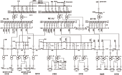 荆门电网目前有220kV变电所4座,110kV变电站18座和一座热电厂。形成了以220kV变电所为支撑,110kV变电站为骨架的供电网络。图一给出了荆门电网反事故演习示意图。