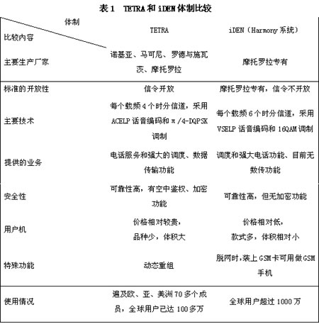 近年来,有多家外国公司向中国推销其数字集群移动通信系统。国际上现有的数字集群通信系统有多种体制,各有千秋。我国信息产业部于2000年底已正式批准和发布了我国“数字集群通信系统体制”电子行业推荐性标准,确定了两种体制,即由欧洲电信标准协会(ETSI)推荐的全欧集群通信TETRA和摩托罗拉公司独家专有的iDEN两个数字集群通信系统体制,是国内的推荐性行业标准。根据民航机场的建设要求,可考虑在TETRA和iDEN体制中选择一种,这两种体制的特点比较如表1所示。