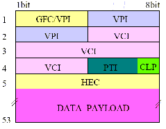 图中1至5字节为信元头,6至53字节为用户数据,UNI时为GFC,NNI时为VPI,VPI和VCI是虚链路的标识号,PTI是负载类型,CLP是优先丢弃指示位,HEC是头部校验和。