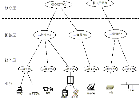 接入层是以二级节点为核心的星型结构,各个三级节点利用SDH数据电路,DDN或卫星电路上联到二级节点。