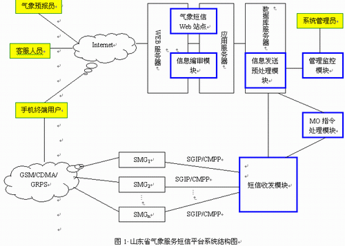 气象服务短信平台主要由如下模块组成:信息编审模块、气象服务定制WEB站点、MO指令处理模块、信息发送预处理模块、短信收发模块和管理监控模块。系统结构图详见图1。
