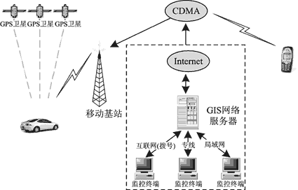 移动终端将GPS数据组成CDMA数据分组,通过CDMA网络和Internet网,上传到信息管理中心服务器。服务器应当具备IP地址和电子地图。