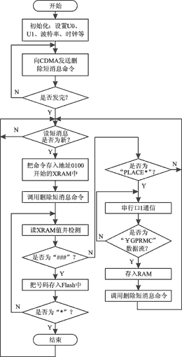 两个不同命令短信的执行,功能子程序是分开的,但前端的判断跳转程序是关联的,所以将两个程序合在一起讨论。该程序包含对两个串口同时操作,先读新消息。如果内容有“PLACE*”,则进入定位信号的提取。判断是否有“###”,有则进入存储号码的功能。
