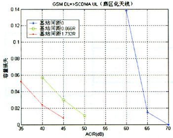 D=1.732R时,要保证SCDMA上行容量损失小于5%,所需的ACIR为35dB。