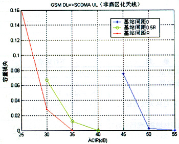 D=0时,要保证SCDMA上行容量损失小于5%,所需的ACIR为47dB;