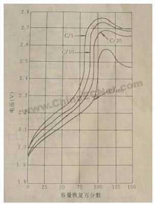 初始的时间与充电速率有关。当充电速率大于C/5时,电池容量恢复到放出容量的80%以前,即开始过充电反应,如右图所示。只有充电速率小于C/100,才能使电池容量恢复到100%后,才开始过充电反应。由右图还可以看出,采用较大充电速率时,为了使电池容量恢复到100%,必须允许一定的过充电,过充电反应发生后,单格电池的电压迅速上升,达到一定数值后,上升速率减小,然后电池电压开始缓慢下降。由此可知,电池充足电后,维持电池容量的最佳方法是在电池组两端加入恒定的是压。这就是说,电池充足电后,充电器应输出恒定的浮充电压。在浮充状态下,充入电池的电流应能补充电池因自放电而失去的电量。浮充电压不能过高,以免因严重过充电而缩短电池的寿命。采用适当的浮充电压,免维护铅酸蓄电池的浮充寿命可达10年以上。实践证明,实际的浮充电压与规定的浮充电压相差5%时,免维护蓄电池的寿命将缩短一半。