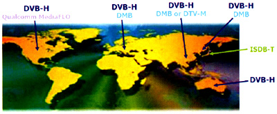 在频谱方面,主要涉及到四个频段:VHF III(174-240MHz)、UHF(470-862MHz)和L1(1452-1492MHz)、L2(1660-1685MHz)。各国对手机电视的频谱规划也并不统一。