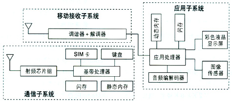 图4为具有接收移动电视广播功能的手机架构。该架构由三个主要的子系统构成:通信子系统、应用子系统和移动接收子系统。我们将重点讨论关于移动接收和应用子系统相关的解决方案。