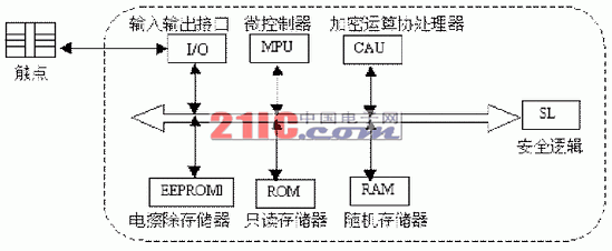 这五个模块必须集成在一块集成电路中,否则其安全性会受到威胁。因为,芯片间的连线可能成为非法存取和盗用PIM卡的重要线索。