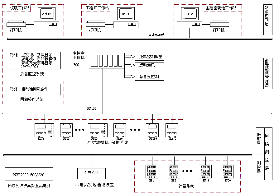 系统采用分层分布、开放式结构,按纵向分为站级控制层、前置数据管理层和间隔测控层。主要结构如下图: