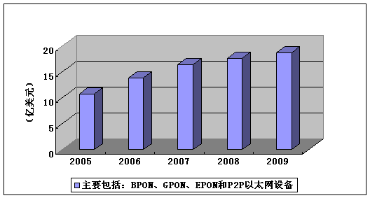 预计未来几年,全球的光纤接入市场将迅速增长,到2009年全球光纤接入设备的收入将达到19亿美元,采用的技术主要包括BPON、EPON、GPON以及P2P 等。从2005到2009年,全球光纤接入市场的年复合增长率将达到16.6%,如图1所示。而视频业务将是全球光纤接入发展的主要驱动力。