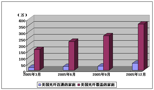 目前美国FTTH市场增长迅速,从2005年10月到2006年1月的四个月里,光纤覆盖的家庭数增加了近100万户,平均每月新增用户23万,全美光纤覆盖的家庭数超过360万。从2005年4月到9月,平均每月新增用户约18万。