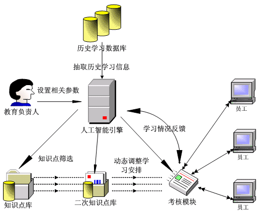 系统在人工智能(AI, Artificial Intelligence的简称)的基础上,为每个员工提供了一个完全智能的学习导师系统。通过该机制的使用,能够极大地提高员工的学习效率。借鉴国际上近年来数字校园领域(Digital Campus)发展的最新成果,针对计算机教学的特殊性(能动态收集学生的所有学习情况、能动态对考生学习情况进行人工